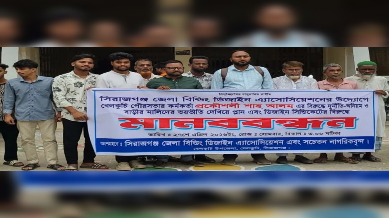 সোমবার বিকেলে বেলকুচি উপজেলা পরিষদ চত্বরে সিরাজগঞ্জ জেলা বিল্ডিং নির্মাণ অ্যাসোসিয়েশন-এর উদ্যোগে এ মানববন্ধন অনুষ্ঠিত হয়।